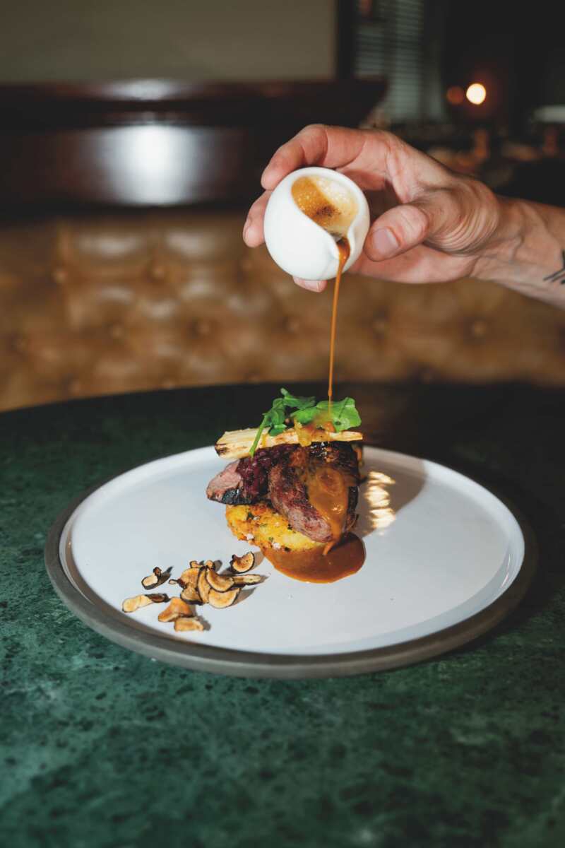 Zodra je binnenkomt, merk je dat NY Basement niet zomaar een restaurant is. Het interieur heeft een duidelijke inspiratie in het New York van de jaren twintig en dertig: jazzclubs, stijlvolle details en een elegante sfeer. De verlichting is warm, de kleuren zijn rijk en het geheel voelt bijna filmisch aan. Je zou je zo in Manhattan kunnen wanen. Het restaurant is bewust kleiner en intiemer dan het grote café-restaurant van Hotel New York op de begane grond. Daardoor voelt een avond hier persoonlijk en ontspannen. Je kunt rustig tafelen, genieten van een goed gesprek en echt de tijd nemen voor het diner. Een opvallend element is de 11 meter lange cocktailbar. Hier shaken bartenders klassieke cocktails zoals een Negroni of Old Fashioned, maar ook verrassende eigen creaties. Veel gasten beginnen hun avond hier met een drankje voordat ze aan tafel gaan. Het geeft de avond meteen een feestelijk begin.