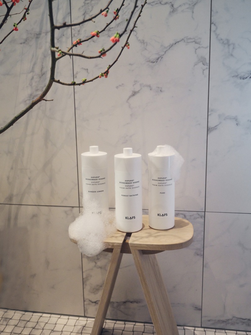 Voor de schuimvorming is een speciaal ontwikkelde ESPURO schuimbadessence beschikbaar. Deze essences zorgen voor stabiel, langdurig schuim en zijn verkrijgbaar in de geuren PURE, GINGER LEMON en FOREST BATHING. Ze zijn gebaseerd op gecertificeerde natuurlijke cosmetica, vegan, dermatologisch getest en bijzonder huidvriendelijk. De essences reinigen en verzorgen de huid en laten een zijdezacht gevoel achter.